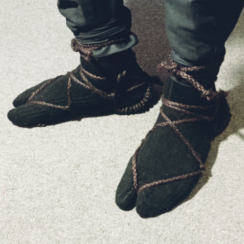 Dark dyed waraji is the best for ninja image, made out of strong jute and soft enough to step without any sound. It can be worn over tabi socks (or even jika-tabi boots) or over your bare feet. Just get used a bit to ties and your ninja's absolute footwear is got.
